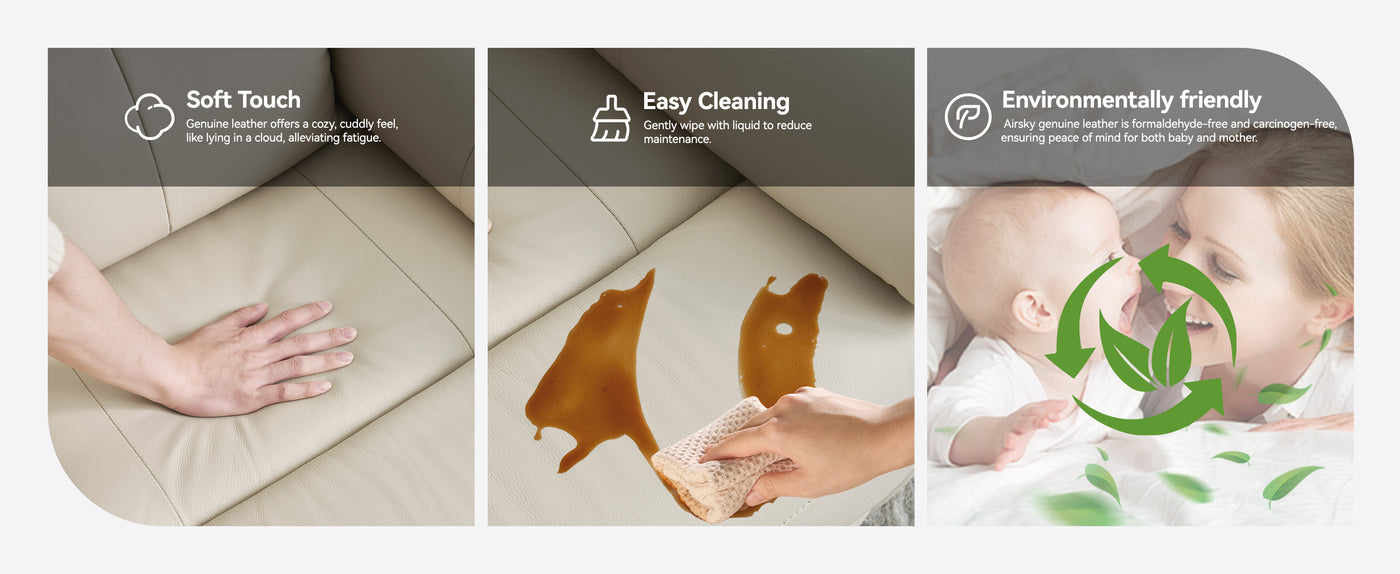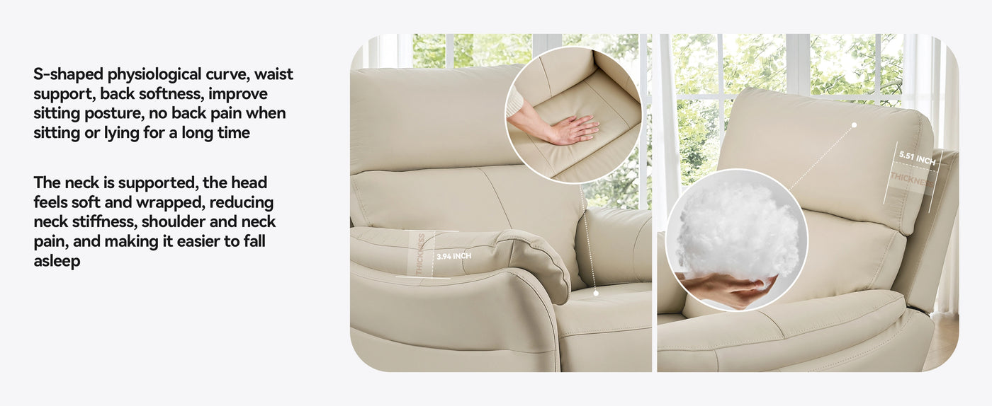 · Top-grain leather material: For this leather recliner chair, the leather from cattle in America, 65% of the leather from each cattle is used for the contact surface of this recliner. Genuine leather covers inside areas such as the back, seat and arm cushions; skillfully matched faux leather covers the remaining areas
